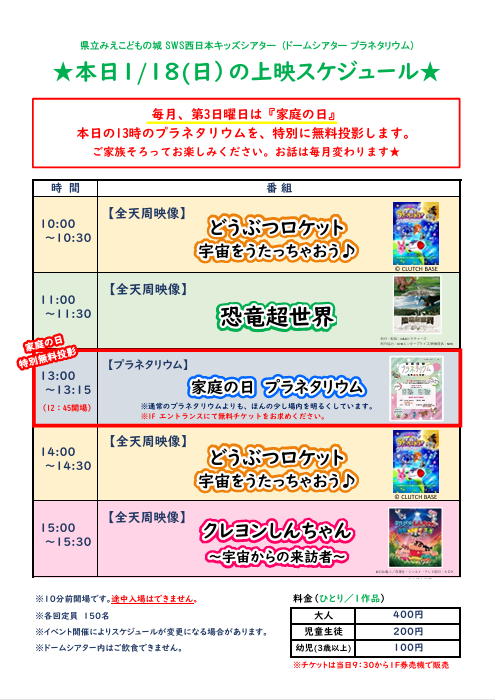 映画・プラネタリウム上映スケジュール★『家庭の日』プラネタリウム特別投影★